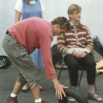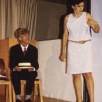 Als Schauspielerin überragte Sabina (Cornelia Daig) ihre Mitspieler. Sie wirkte immer überzeugend, eindringlich, vielseitig - von nörgelnder, kündigender Haushaltsgehilfin bis zur verführerischen Schönheitskönigin - und virtuos in ihrer Zweisprachigkeit. Wilders Regieanweisungen wurden durch Sprachwechsel herausgearbeitet, eine faszinierende Möglichkeit des fremdsprachlichen Theaterspielens: Als Archetypen sprach die Familie Antrobus (deren Name auf Griechisch „Mensch" bedeutet) Englisch, als Individuen auf der Bühne ihre Muttersprache. Dabei machte das unverfälschte Schwäbisch des Mr. Antrobus (Dieter Reichl) für Bamberger Ohren den Bewußtseinswechsel besonders deutlich. Er bestand überzeugend die harte Prüfung der Sprachwechsel und des Rollenwechsels vom genialen Familienvater zum Präsidenten der Säugetiere wie auch zum heimkehrenden Soldaten. Durch große Leistungen der Maskenbildner (Sigrid Kolster und Gabi Allgeier) gestützt, spielten die anderen Darsteller zur Hochform auf. So Mrs. Antrobus (Iris Wagner), deren Temperamentsausbrüche zur Rettung des Glücks ihrer Kinder bei aller sonstigen Biederkeit immer echt wirkten. So auch Henry, der notorisch unartige und unruhige Sohn, der als „Kain" mit einem leuchtend roten Mal gezeichnet war (Alexander Hopf). Die Flüchtlinge erhielten alle in der Eiszeitszene ihre individuellen Entfaltungsmomente und beeindruckten durch oder wegen der extremen Verschiedenheit der einzelnen Rollen.